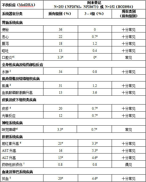 本说明书描述了在临床试验中和上市后应用观察到的可能由阿来替尼引起的不良反应及其近似的发生率。由于临床试验是在各种不同条件下进行的,在一个临床试验中观察到的不良反应的发生率不能与另一个临床试验观察到的不良反应发生率直接比较,也可能不能反映临床实践中的实际发生率。